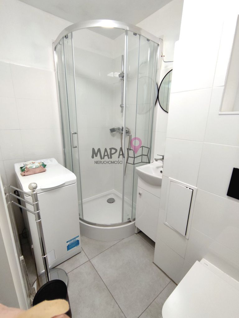 Niewielka łazienka - kabina prysznicowa, umywalka, toaleta i pralka.
